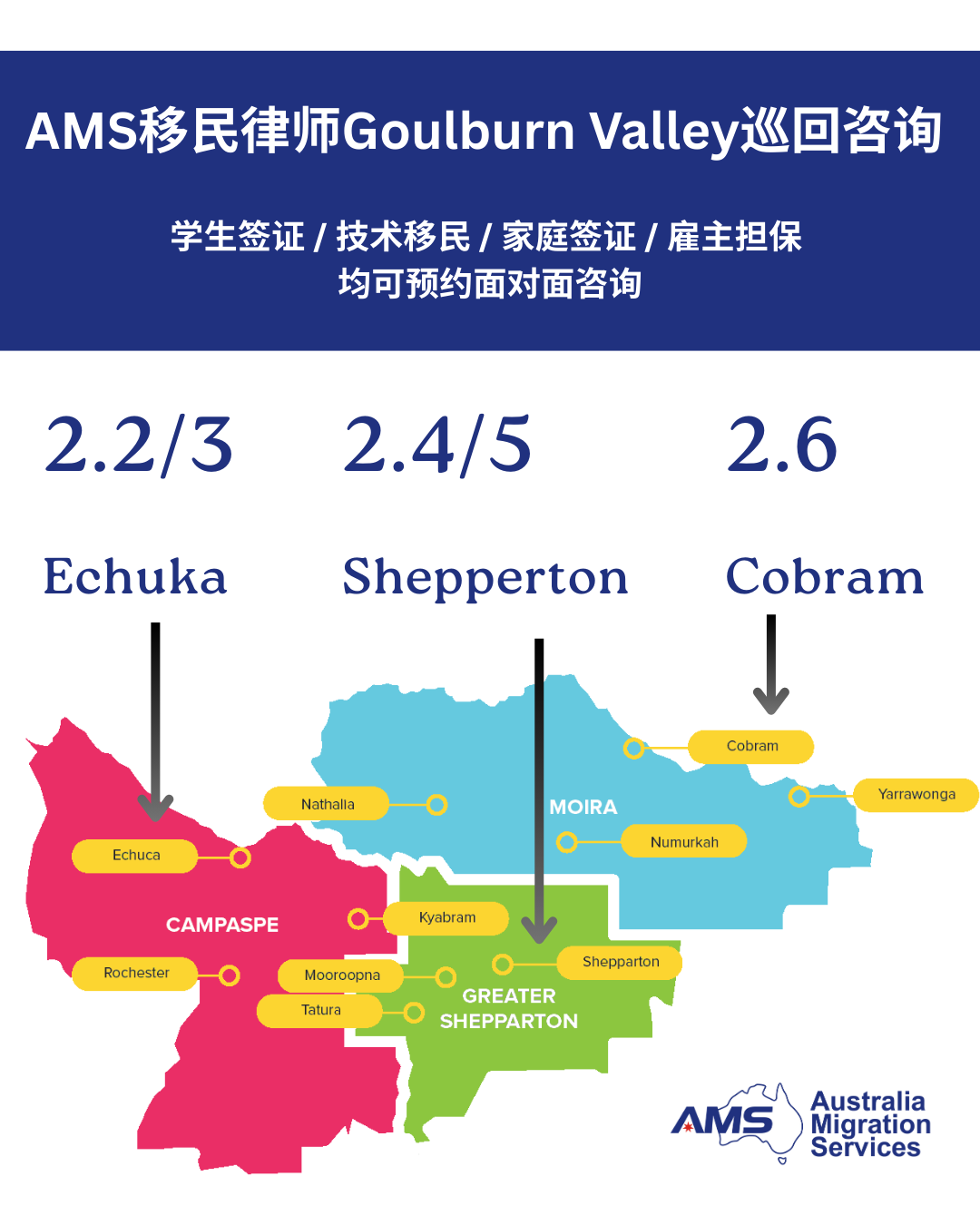 二月初,AMS 移民律师团队将亲临 Goulburn Valley,为当地客户提供一对一、面对面的专业签证咨询服务。