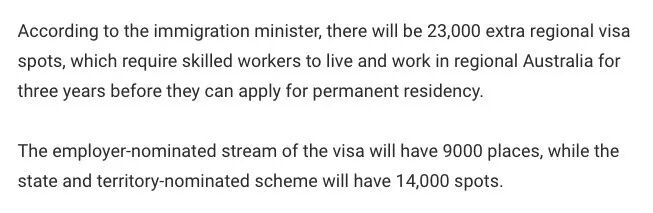 其次,政府发布了一系列针对偏远地区和雇主担保的重大利好。其中包括引入2个新的偏远地区技术移民签证,每年将有2.3万个永居配额。