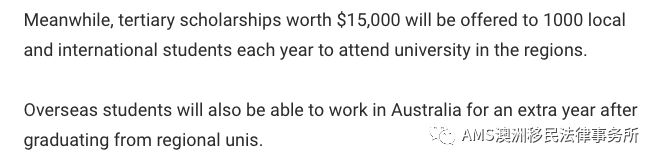 在偏远地区学习的留学生,毕业以后申请485的期限将比非偏远地区的多一年。同时,政府将给部分在偏远地区学习的本地学生和留学生提供1.5万澳元的奖学金,总名额是1,000个。